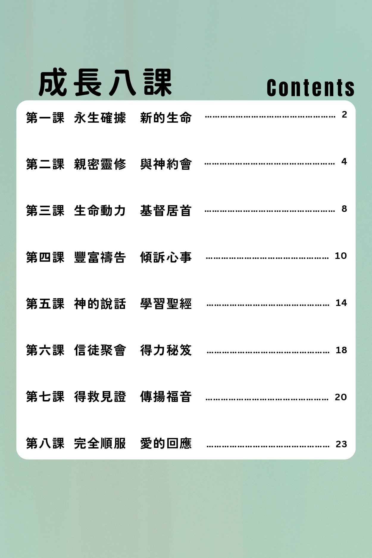 我們一起成長 日語門徒訓練:每週 • 星期四線上 ZOOM20:00 報名 / 了解更多成長8課:每週 • 星期四線上 ZOOM 21:15 報名 / 了解更多 國語門徒訓練:每週 • 星期一線上 ZOOM 21:15 報名 / 了解更多每週 • 星期四線上 ZOOM 20:00 報名 / 了解更多成長8課:每週 • 星期一線上 ZOOM 20:00 報名 / 了解更多禱告會:每週 • 星期三線上 ZOOM 21:00 報名 / 了解更多 粵語門徒訓練:每週 • 星期四線上 ZOOM 21:30 報名 / 了解更多 國語、英語、日語男人組: 每週 • 星期五線上 ZOOM 21:00 報名 / 了解更多 我們一起學習 聖經分享課程目錄 成長八課目錄
