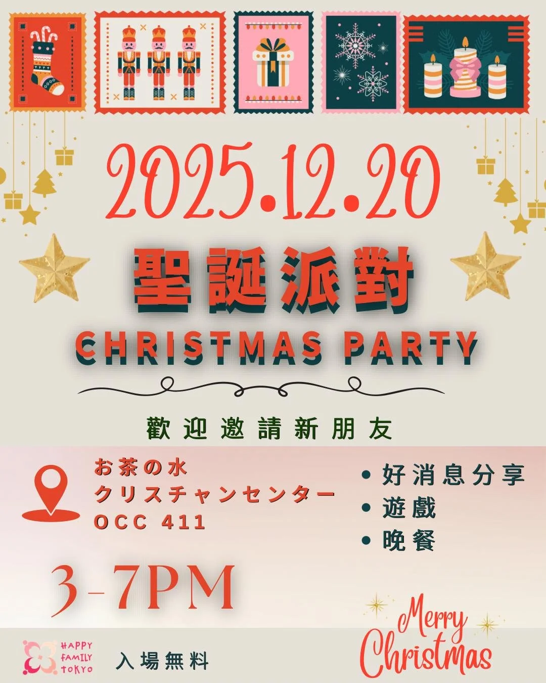 Back to All Events 聖誕派對 聚會 Saturday 20 December 2025 15:00 19:00 Ochanomizu Christian Center Bldg. Room 411 2-chōme-1 Kanda Surugadai, Chiyoda City, Tokyo 101-0062 Japan (map) Google Calendar ICS 每月 第三週 星期六12月20日(星期六)聚會 15:00 ~ 17:30晚飯 18:00 ~ 19:00請在這裡報名直播連結