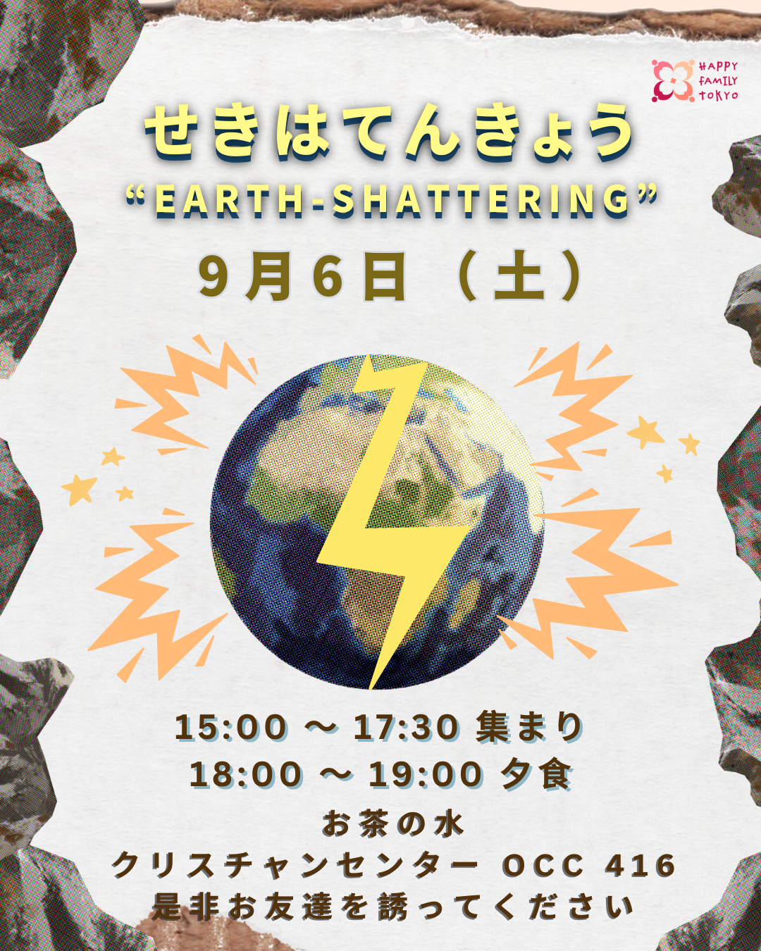 広東語/日本語礼拝 2025年9月6日(土) 15:00 19:00 お茶の水クリスチャン・センター 416号室 101-0062 東京都千代田区神田駿河台2丁目1番地 神田駿河台 (地図) Googleカレンダー ICS 毎月 第1週 土曜日9月6日(土)礼拝 15:00 ~ 17:30夕食 18:00 ~ 19:00お申し込みはこちらから