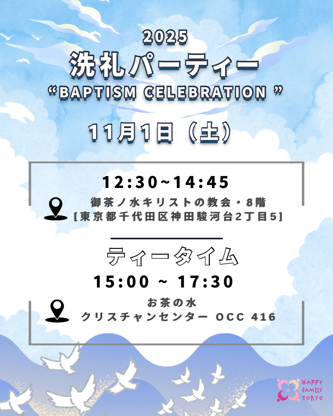洗礼パーティー 2025年11月1日(土) 12:30 17:30 Ochanomizu church of Christ Floor 8 2-chōme-5 Kanda Surugadai, Chiyoda City, Tokyo 101-0062 Japan (map) Googleカレンダー ICS 11月1日(土)洗礼パーティー 12:30 ~ 12:45下午茶 15:00 ~ 17:30お申し込みはこちらから