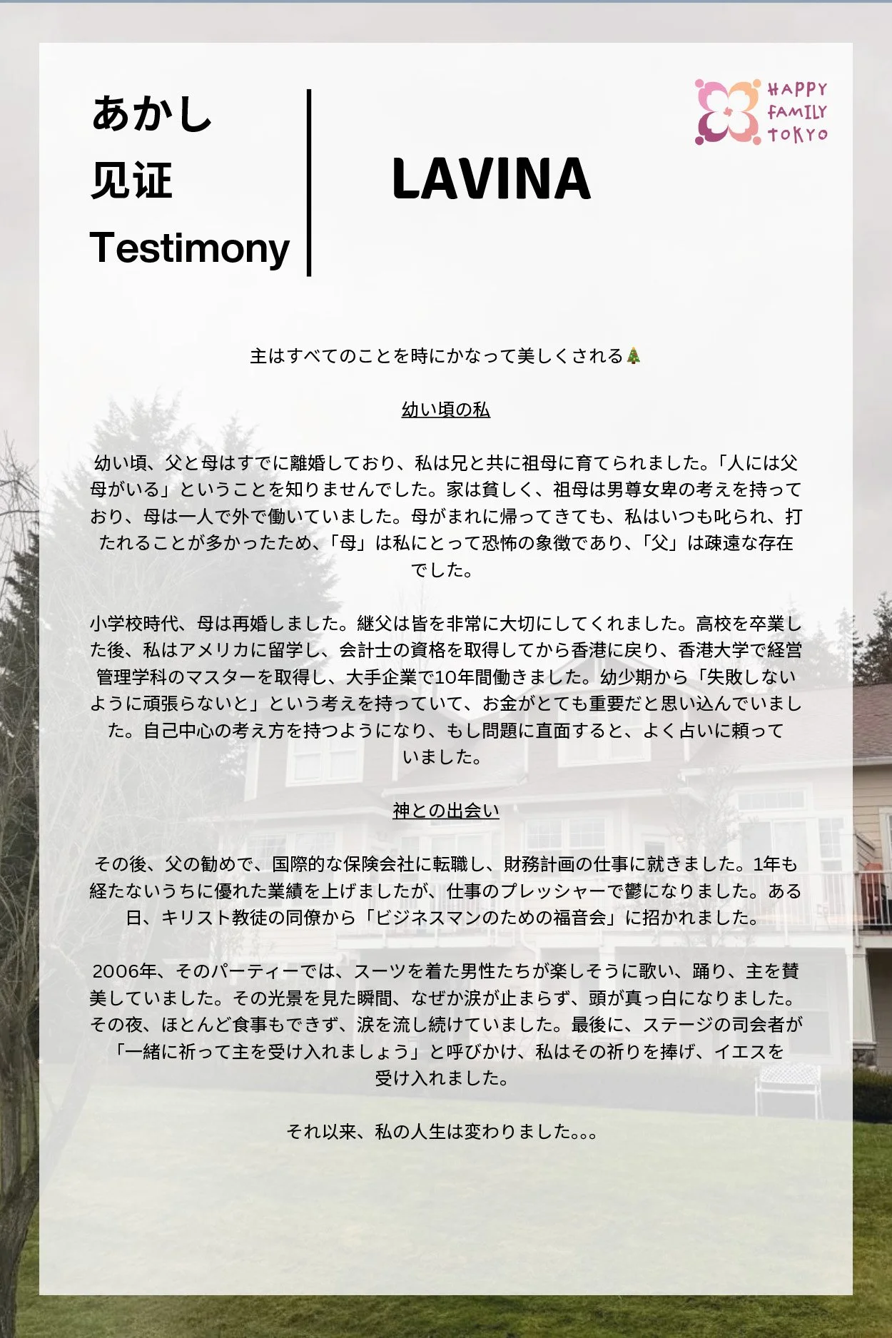 Lavina 証 2月1日 文: IPGデザイン Youtube: 2025年02月01日 | 主はすべてのことを時にかなって美しくされる! 証のシェア ダウンロード (日/中) 東京tokyochurch聚会家族国際东京教会友達を作りたい粵語聚會 IPGデザイン