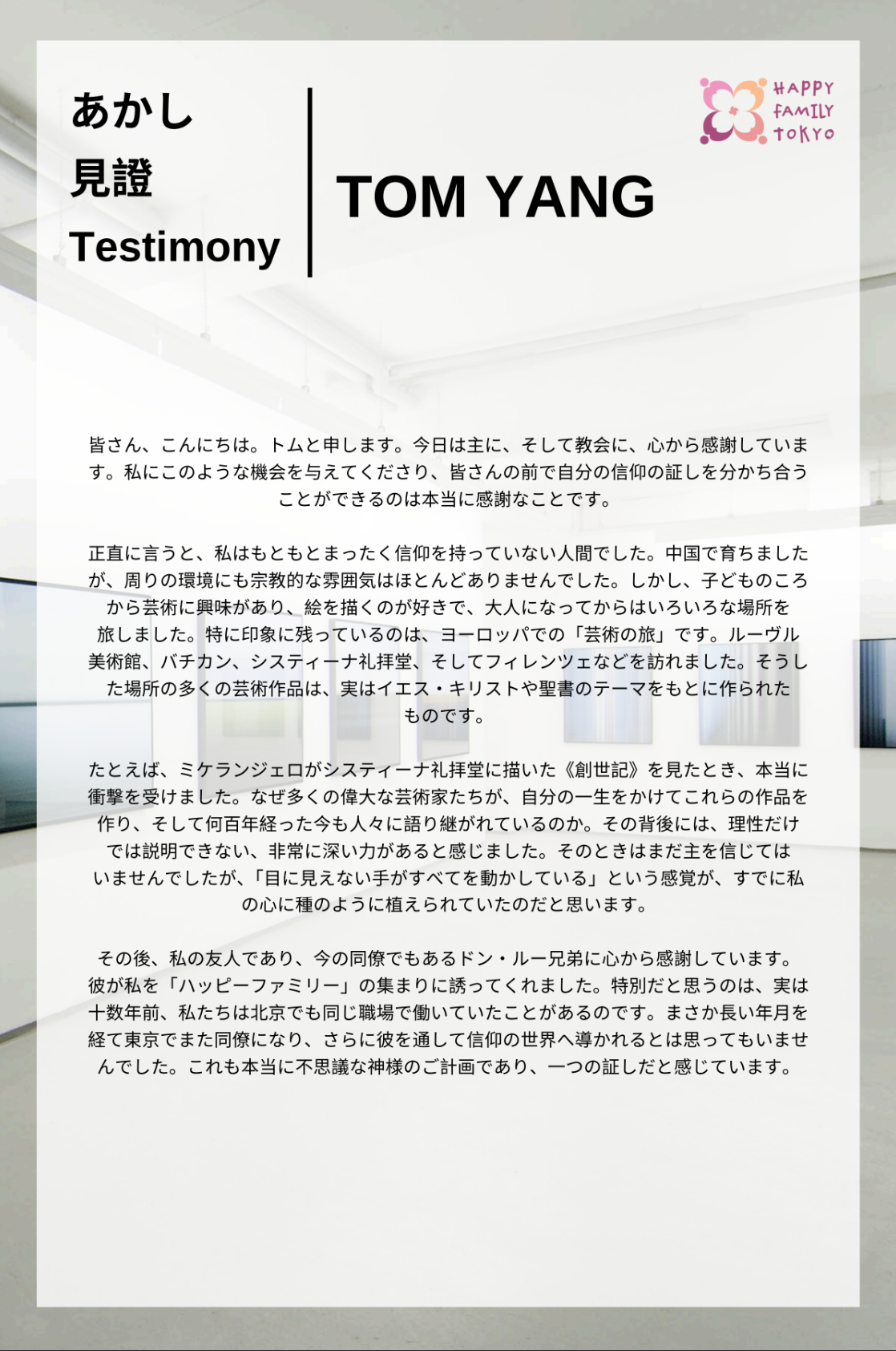 Tom Yang 証 11月1日 文: IPGデザイン Youtube: 2025年11月01日 |Tom Yangの証しのシェア ダウンロード (日/中) 東京tokyochurch聚会家族国際东京教会友達を作りたい粵語聚會 IPGデザイン