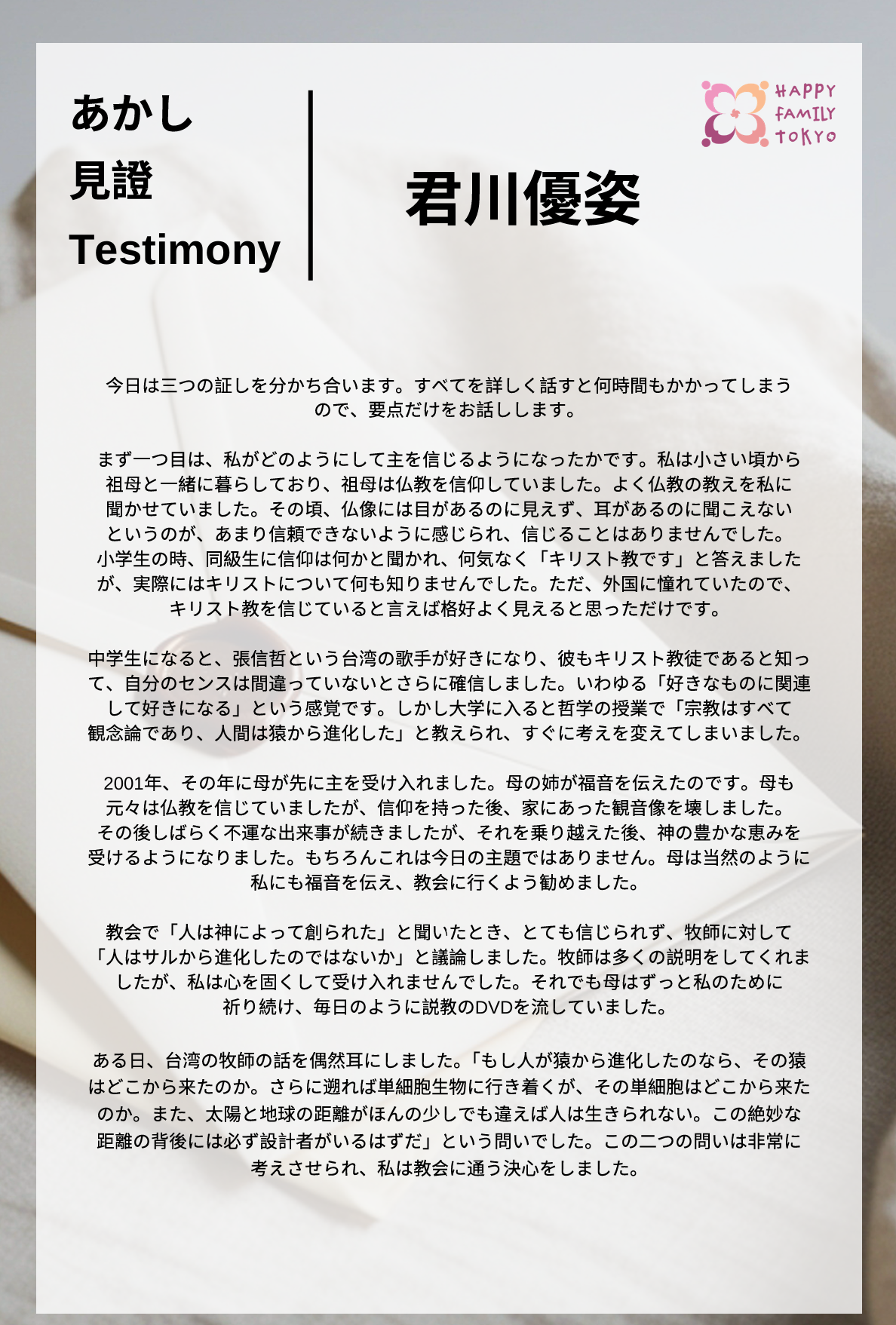 君川優姿 見證 7 Mar Written By IPG Design Youtube: 2026年3月7日 |君川優姿見證分享 下載見證 (日/中) 東京tokyochurch聚会家族国際东京教会友達を作りたい粵語聚會 IPG Design